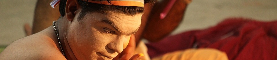 Le kathakali –sorte de laïcisation avant la lettre de la danse sacrée, peut-être même d’une origine plus ancienne que cette dernière, le kathakali est un drame danse typiquement dravidien et dont les thèmes ne sont plus d’adoration, mais de description de scènes généralement tirées des grands poèmes ou des légendes locales ou, naturellement, interviennent les dieux, ceux-ci ne se pouvant concevoir comme absents d’aucune activité humaine. Ces drames dansés se jouent généralement la nuit sur la place des villages du Kerala, a la lueur des flambeaux, et durent parfois plusieurs nuits de suite, utilisant pour le jeu scénique toutes les ressources codifies par Bharata, en outrant parfois certaines des poses et mudra. Essentiellement un théâtre d’hommes, c’est un cirque héroïque et muet, ou l’expression exagérée et le maquillage fantastique jouent un rôle primordial.