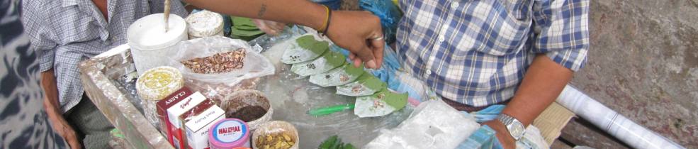 Le vendeur de pan fait partie du paysage indien: devant lui, les précieuses feuilles sont mises a rafraîchir dans une bassine d’eau et, sur son étal, sont disposes les pots de chaux et d’épices.