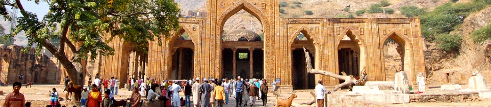 La mosquée Adhai-din-ka-Jhonpra dont les vestiges se dressent au sud-ouest d'Ajmer est un ancien collège jaïn transformé sur les ordres de Mohammed de Ghour qui prit la ville en 1192 et fit dresser un très bel écran de sept arches devant les anciennes colonnes aux mille façons. Son nom qui signifie l'abri de deux jours et demi viendrait de la durée donnée par le conquérant afghan pour en faire un lieu de prières, cette durée est aussi celle de grands rassemblements de fakirs qui s'y rendaient chaque année dès la fin du XVIIIème siècle. Deux petits minarets porteurs d'inscriptions tughra ornent les angles de l'arche principale qui atteint près de 18 mètres. A proximité de cette mosquée, se trouve l'un des sanctuaires les plus sacrés de l'Inde musulmane - le Dargah (sanctuaire) Khwaja Sahib - à la construction duquel ont contribué plusieurs souverains, d'Altamish à Humayun, ce sanctuaire abrite en effet le mausolée de Khwaja Muin-ud-Din Chishti (1142 - 1256), grand saint de l'islam, vénéré par d'innombrables pèlerins depuis sept siècles, de l'Inde et d'ailleurs. On pénètre dans l'enceinte du sanctuaire par une porte élevée et imposante, Buland Darwaza, deux larges chaudrons sont destinés à recevoir les offrandes alimentaires qui seront ensuite partagées entre les membres du personnel affectés au lieu saint. Deux très belles mosquées s'élèvent dans des cours successives, la première de grès rouge, construite par Akbar, la seconde de marbre blanc édifiée par Shah Jahan. Le tombeau du saint est au centre de la deuxième cour sous un édifice carré de marbre blanc surmonté d'un dôme très arrondi à l'intérieur duquel on accède par deux entrées dont l'une est entourée d'un arc d'argent, dans une atmosphère de grande pureté. Bibi Hafiz Jamal, fille du saint, et Chimni Begam, fille de Shah Jahan, sont enterrées un peu plus loin dans une petite enceinte décorée d'écrans de marbre blanc où vous ne pourrez entrer si vous n'êtes pas musulman.