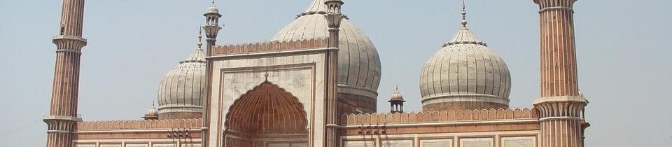Elevée, au sud-ouest du Fort Rouge, sur un soubassement supporté par un affleurement rocheux, la Jama Masjid (la grande mosquée des assemblées du vendredi), second grand monument dont Chah Jahan dota sa capitale, est la plus vaste mosquée de l'Inde. Je vous conseille, les jours où il fait chaud, de la visiter (si nous en avons le temps) tôt le matin ou tard dans l'après-midi. Vous comprendrez pourquoi quand vous aurez devant vous le spectacle de ses trois redoutables volées de marches pyramidales montant jusqu'au corps de garde. En haut, une cour de cent mètres carrés est enclose dans l'ombre de longues colonnades voûtées ayant à chaque angle un pavillon coiffé d'un dais.