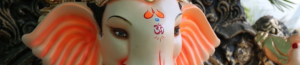 Fils de Shiva et Parvati, c’est le frère de Kartik, aimable dieu de la guerre monte sur un paon. C’était, a sa naissance, un superbe bébé à qui le néfaste Shani (Saturne) coupa la tête en le saluant maladroitement avec son sabre. Vishnou promit de la remplacer par celle du premier être rencontré dormant vers le nord, position faste. Ce fut un éléphant ! En compensation, Ganesh serait vénéré avant tous les autres dieux; c’est pourquoi on trouve son image à l’entrée de chaque temple, à la porte de nombreuses maisons. C’est lui que l’on invoque avant d’entreprendre quoi que ce soit: écrire une lettre, lire ou écrire un livre (son image ou son mantra figure généralement en tête d’un ouvrage), commencer un nouveau travail, partir en voyage (il est généralement présent non loin des gares), car il écarte les obstacles. C’est le sens d’un de ses noms: Vinayak, cependant qu’au service des dieux. Dans ses quatre mains, il porte toujours un croc a éléphant et un lacet, et souvent un livre (c’est à lui qu’a aurait été dicte le Mahabharata), ou un rosaire, ou encore un pot friandises dont sa bedaine est pleine. Sa monture dérisoire est un rat. Pétillant d’intelligence et d’astuce, gourmand, aussi fin qu’il est gros, il est une sorte d’ange gardien vénéré dans l’Inde entière par la presque totalité des hindous. Sa fête annuelle- Ganesh Chaturti, particulière la lune croissante de Bhadra (août-septembre).