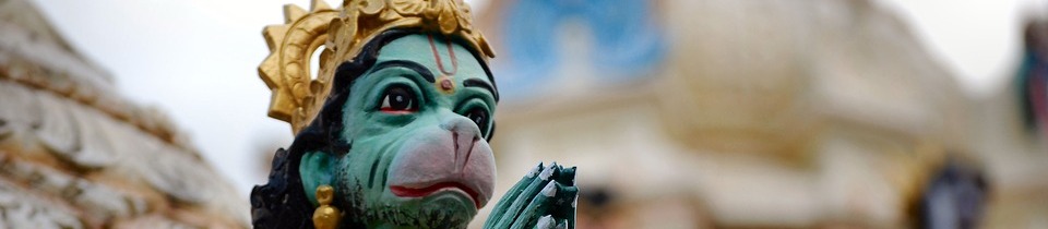Hanuman, le dieu singe est vénéré partout en Inde, particulièrement dans les villages. Avec sa tête de singe, son corps puissant et bien bâti et sa longue queue, ce dieu se reconnaît aisément. Mais il y a d'autres façons de le représenter, parfois avec cinq têtes et dix bras, les quatre autres têtes étant celles d'un homme-oiseau(Garuda) d'un sanglier, d’un cheval et d’un homme-lion.